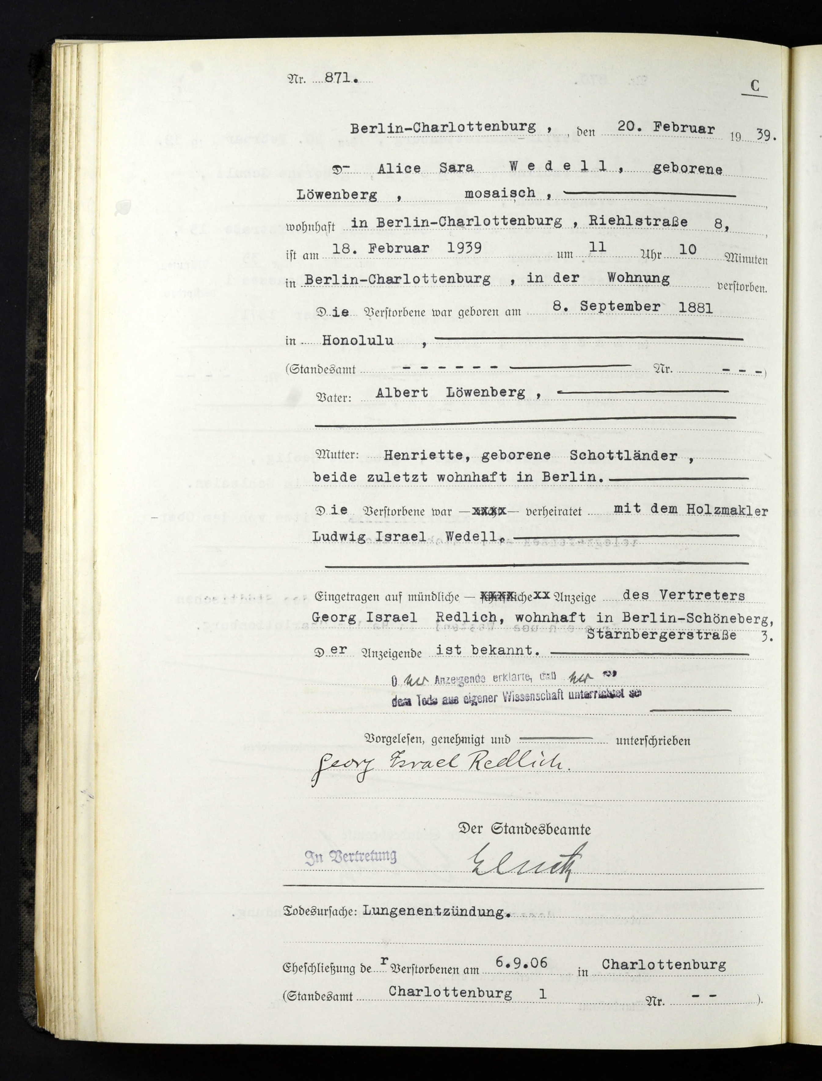 On 6 Sep 1906, Alice married Ludwig Wedell, a timber broker, in Charlottenburg, Germany.