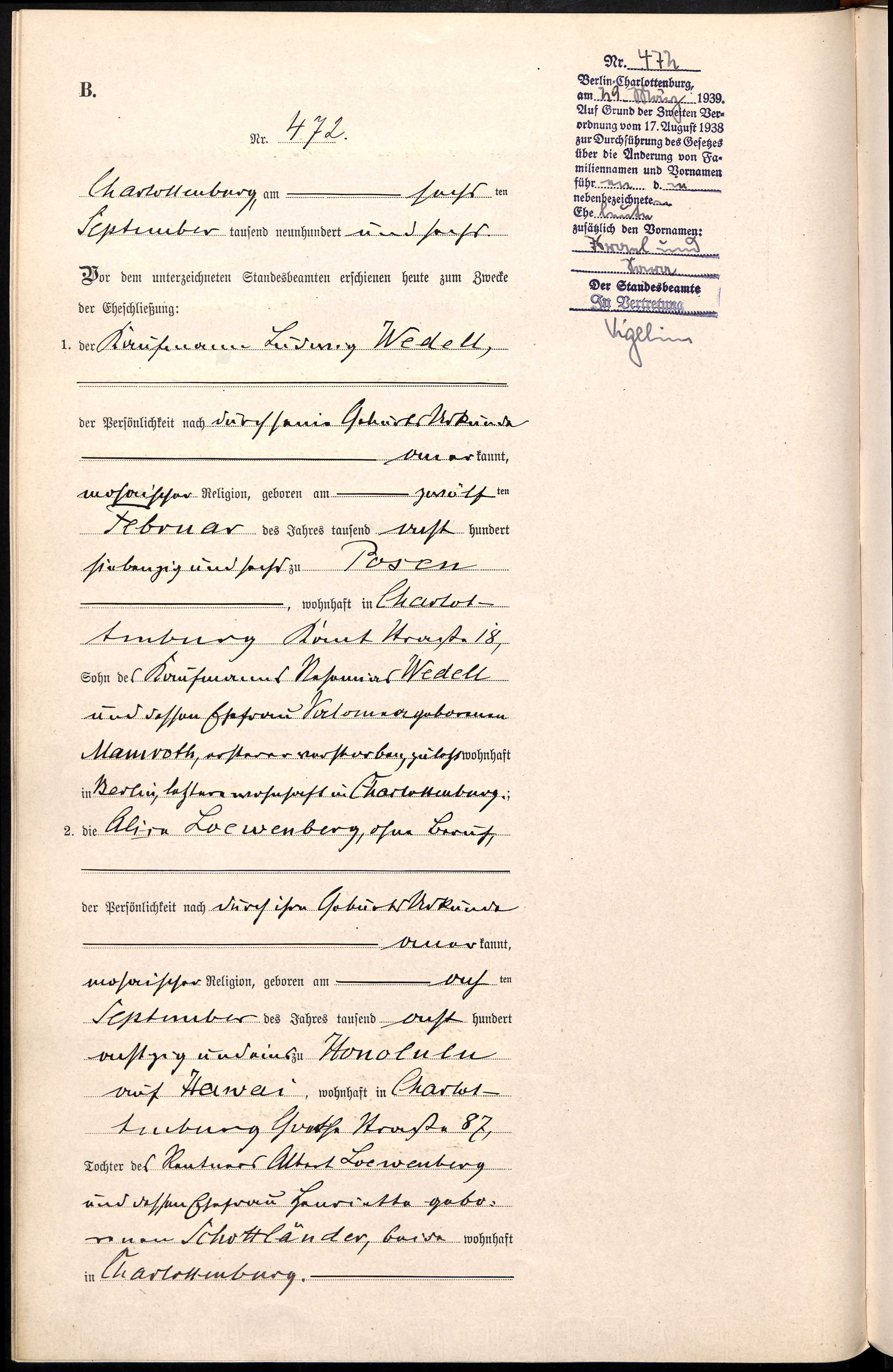 Marriage certificate of Ludwig Wedell and Alice Loewenberg. The stamp in the upper right-hand corner reflects their legal first names changed to Israel and Sara on 29 March 1939 (by order of the Berlin Chief of Police, effective 10 January 1939).