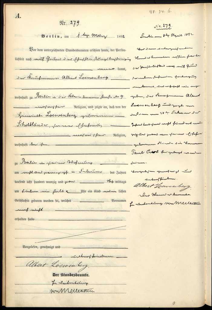 | Paul’s birth certificate, which reveals he was unnamed at his birth on March 1, 1892. Te hand-written text in the right margin, dated April 8th, states he was later named Paul Kurt. |